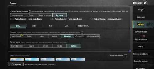 Мы сразу же установили максимальные настройки графики, а частоту кадров поставили на «Экстрим», однако, судя по всему, на таких параметрах автоматически ставится лок в 60 FPS, так как, независимо от того, какой мы режим выбирали – «Сбалансированный» или «Производительный» – фреймрейт все равно не превышал 60, хотя было видно, что устройство может выдать и больше.