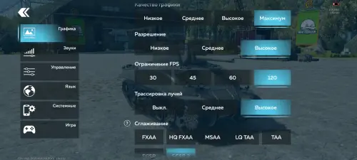 В мобильной версии военного сетевого экшена помимо танковых боев есть также сражения на кораблях и самолетах. Для демонстрации возможностей устройства мы выбрали битву на танках. Впрочем, в остальных режимах ситуация будет аналогичной. Мы выбрали максимальные настройки графики, поставив ограничение кадров на 120 FPS, хотя можно было вполне обойтись 60.